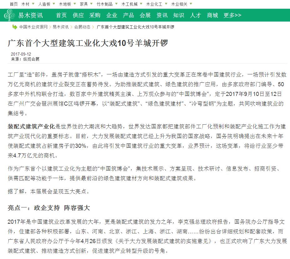中國木材網(wǎng)發(fā)布有關2017中國筑博會·廣州開幕式的報道 (2017-10-30)
