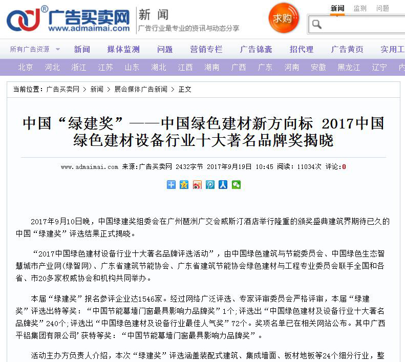 中國(guó)門窗幕墻資訊網(wǎng)發(fā)布有關(guān)2017中國(guó)綠色建材設(shè)備行業(yè)十大著名品牌獎(jiǎng)的報(bào)道 (2017-10-30)
