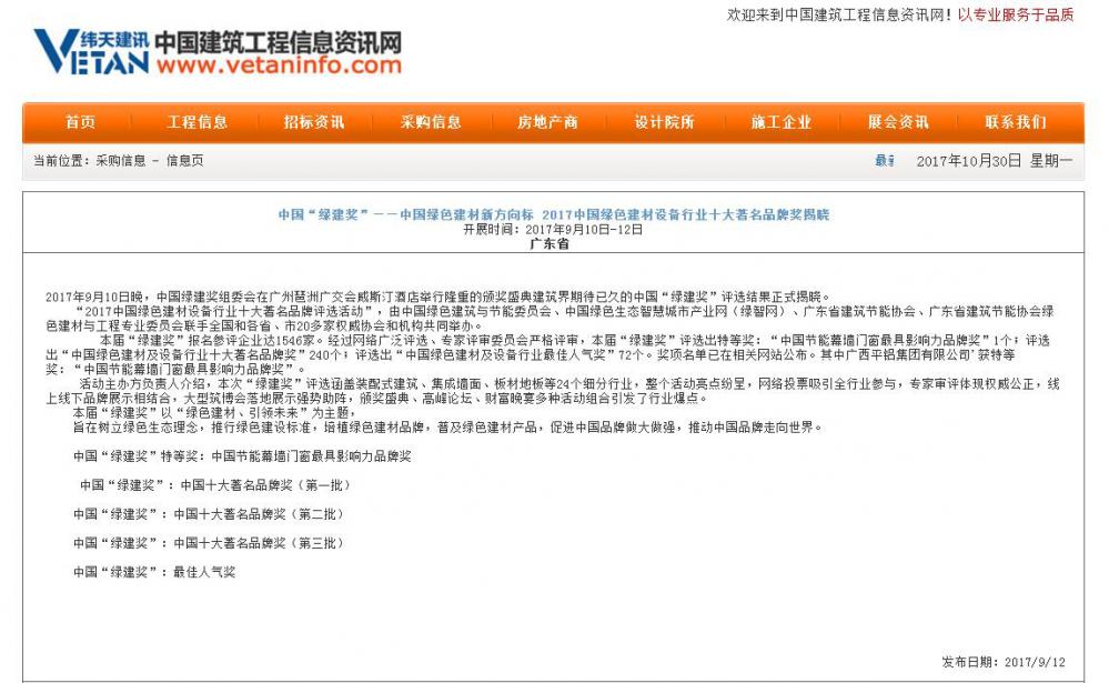 中國門窗幕墻資訊網發布有關2017中國綠色建材設備行業十大著名品牌獎的報道 (2017-10-30)