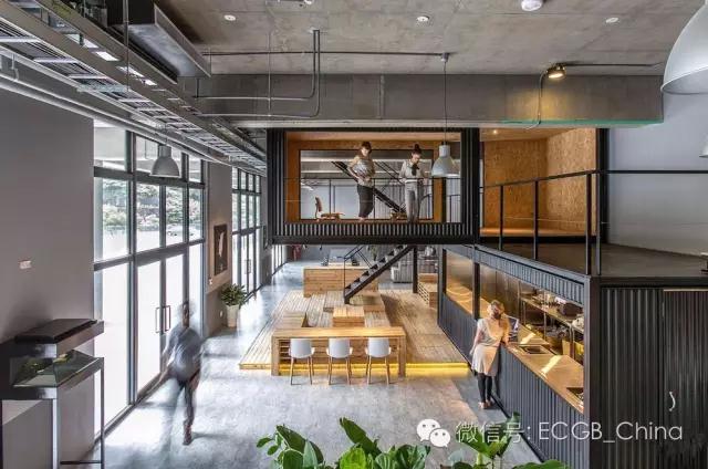 這個改造案例位于廣東珠海高新區南方軟件園,共由36個集裝箱構成。外觀在黃色和一些圖案的修飾下還是很好看的。內部有辦公區、會議室、活動室、餐廳、咖啡Bar、花園露臺,還有個小型的健身房,可謂一應俱全。